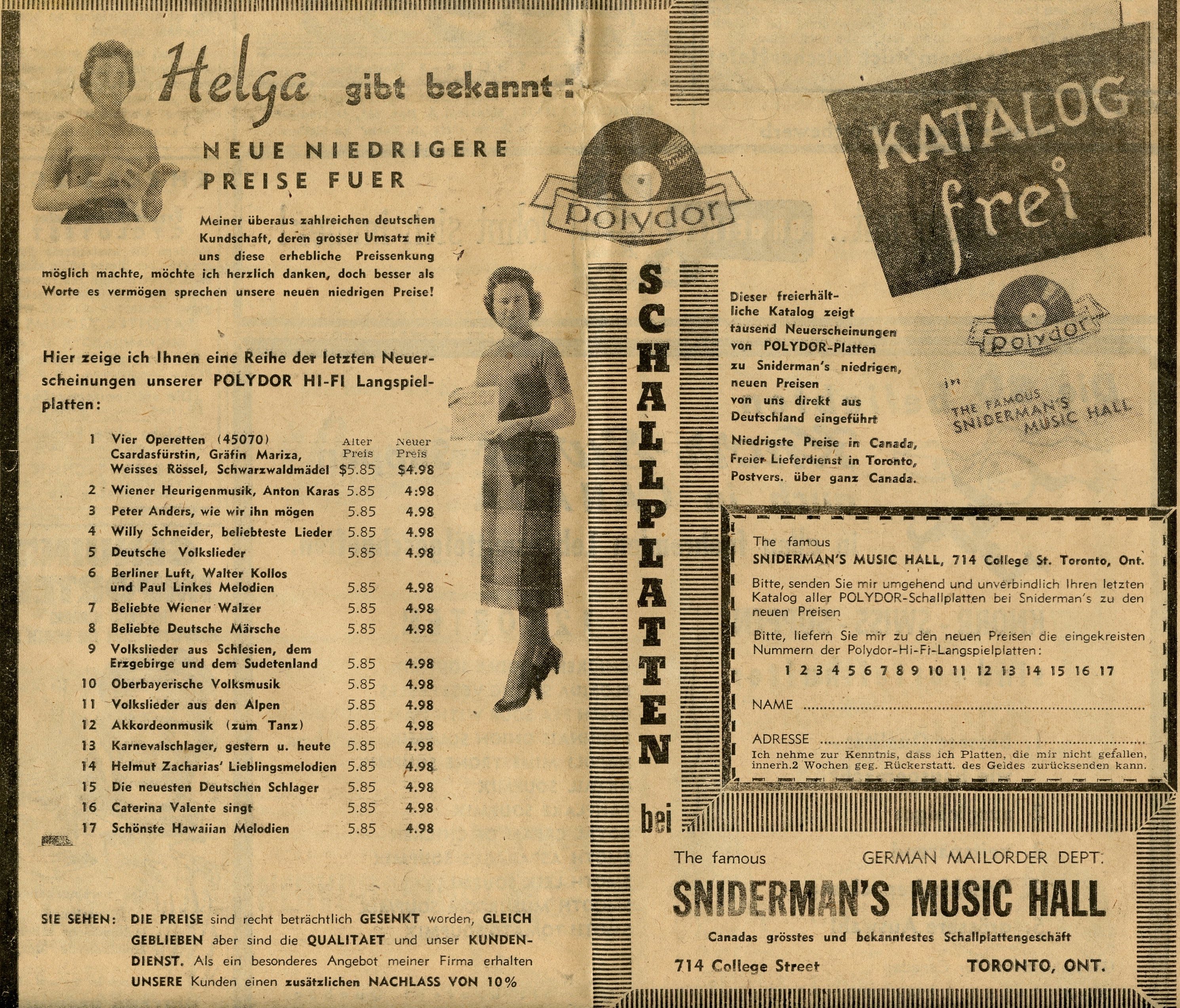 In 1955, Helga Schuliakewich got a job selling records at Sniderman Radio Sales and Service at 714 College St., where Sam Sniderman (a.k.a. Sam the Record Man) ran the store’s record department, Sniderman’s Music Hall. Helga still talks of “Sammy” with great affection and gratitude for his generosity toward her and her sister, Karin, new immigrants from Germany.