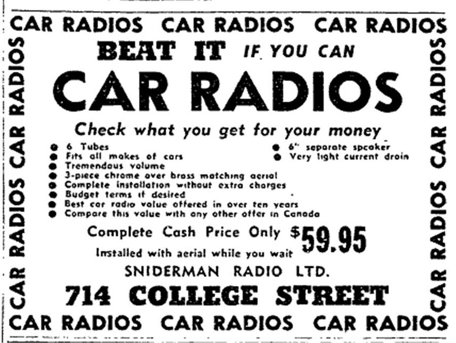 Ad for car radios at the 714 College St. store.
